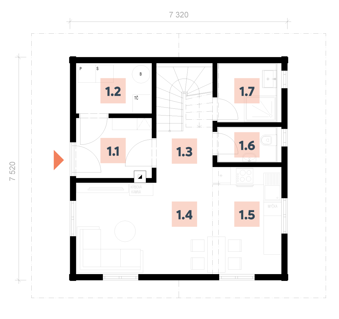| 1.5 | Kuchyně s jídelnou: 8,54 m2 |